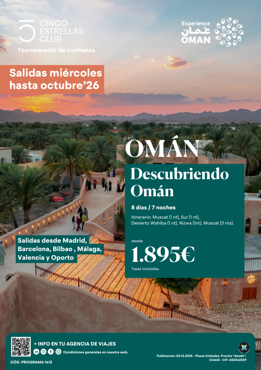Omán sal. hasta oct'26 Descubriendo Omán 8ds/7ns dsd 1.895€ dsd Mad,Bcn,Bio,Agp,Vlc, Opo