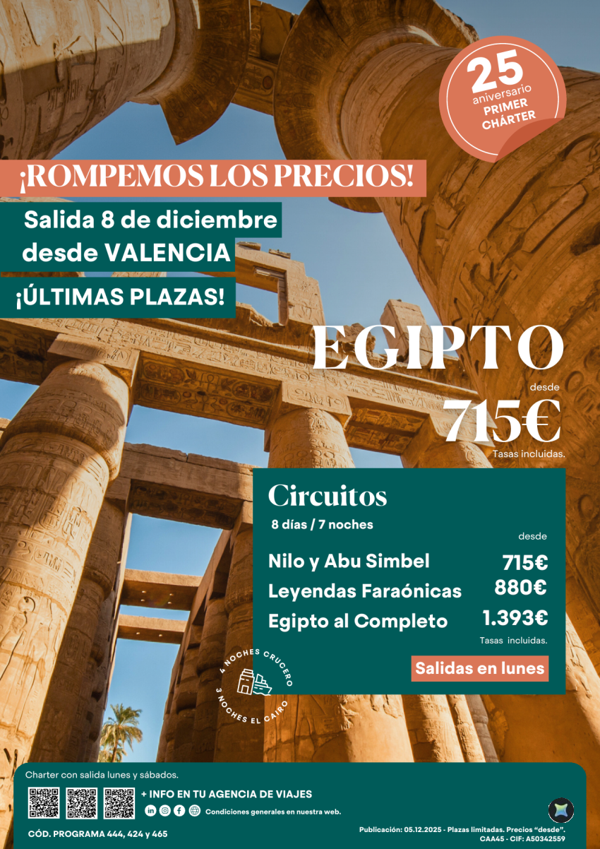 Últimas Plazas! Egipto salidas dic: 8 desde 715€ Nilo y Abu Simbel 8ds/7ns sal. dsd Valencia . Reserva ya!!!